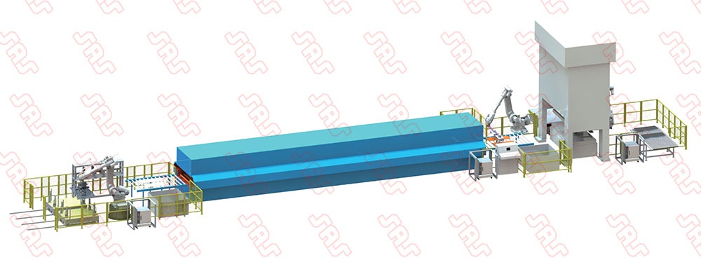 The high-strength steel hot forming automatic production line is an automatic production line integrating material conveying, coding, heating, anti-oxidation, stamping, quenching, cooling, cutting and shot blasting. The high-strength steel plate is heated to 900-1000℃, stamped and formed and rapidly cooled and quenched to realize the transformation from austenite to martensite, thereby obtaining workpieces with higher strength (1200-1500MPa) and higher hardness, which can be widely used It is used in the forming of automobile body parts to realize the lightweight of automobiles and improve the safety of automobile collisions.