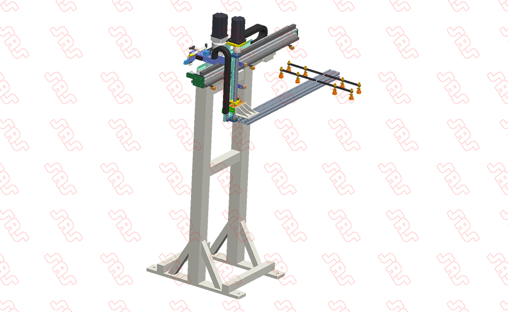 采用緊湊的機身,安裝在兩臺沖床之間,全伺服系統能夠快速的取出板料,機器人從板料下面吸取后翻面,整個過程同步進行,提高板料翻面生產時的整線節拍。